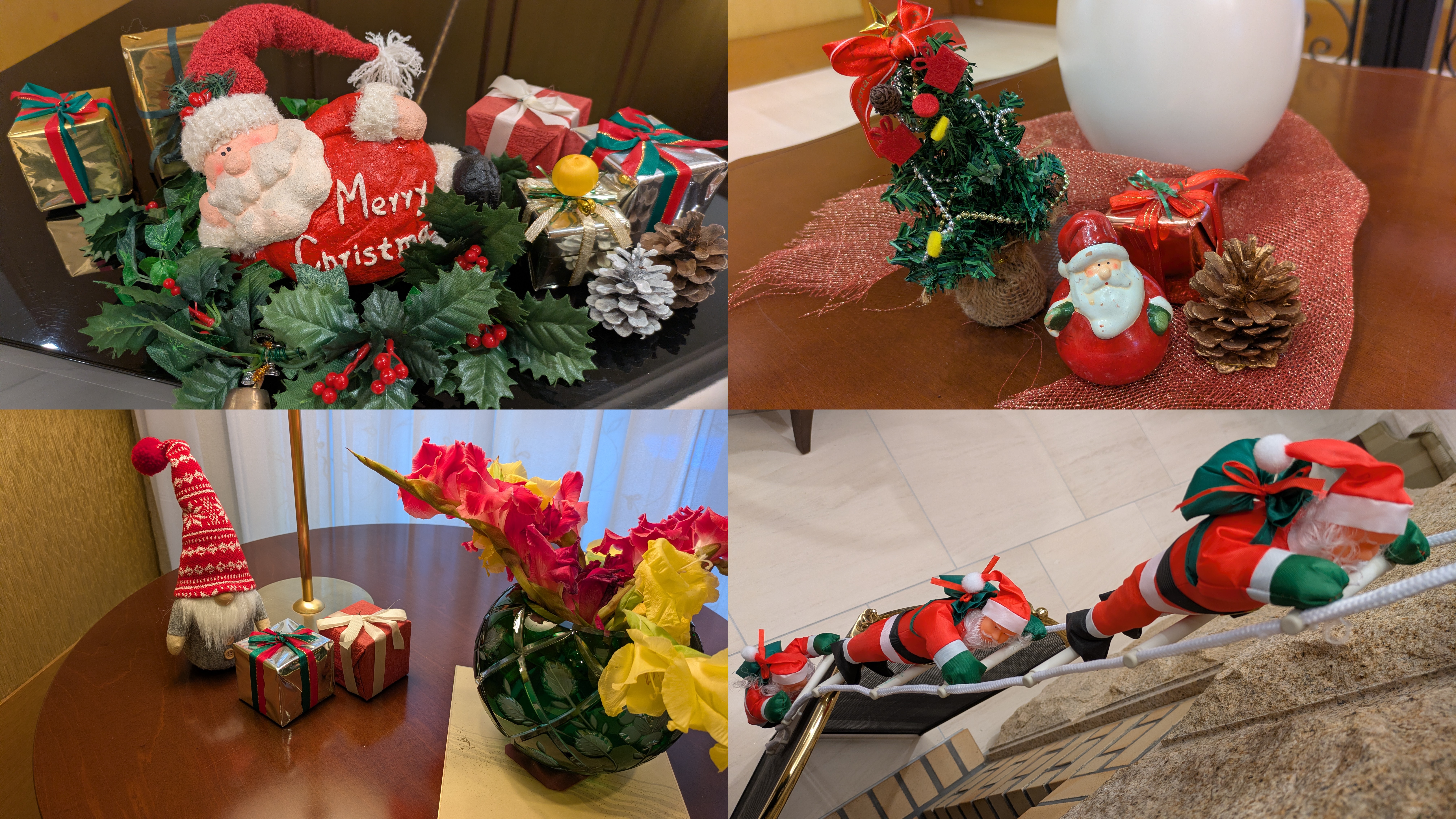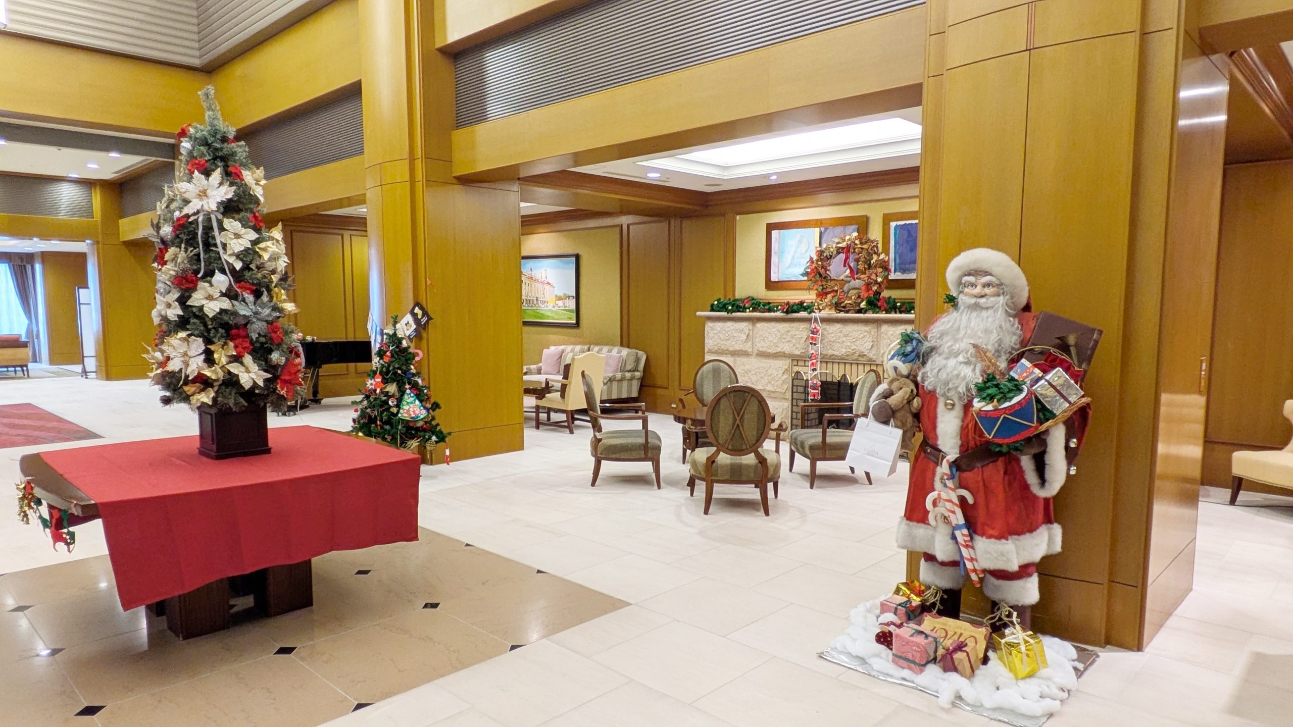 今年のクリスマスシーズンには恒例のサンタクロース人形をはじめ、ロビー全体を彩る華やかなクリスマス装飾をしました。