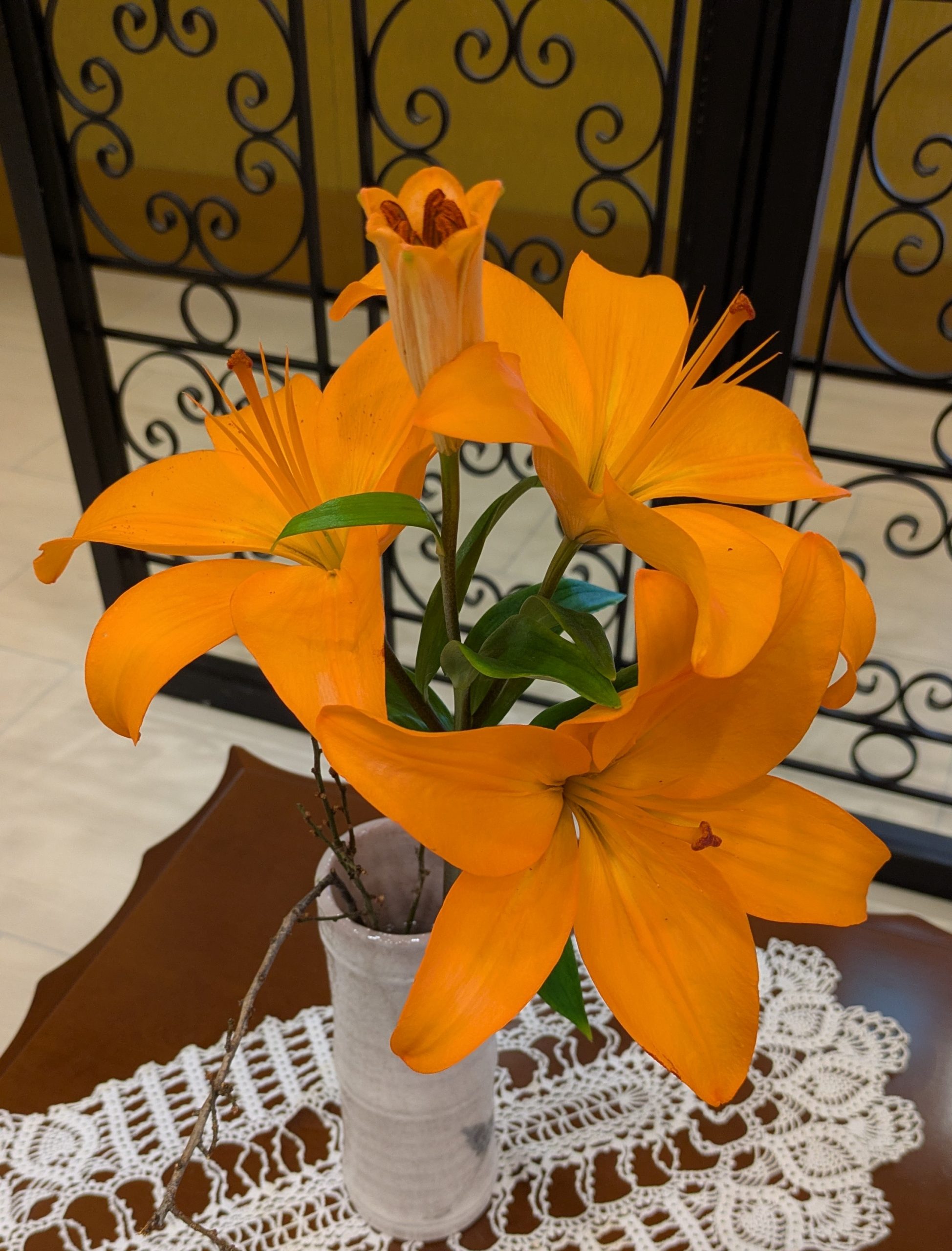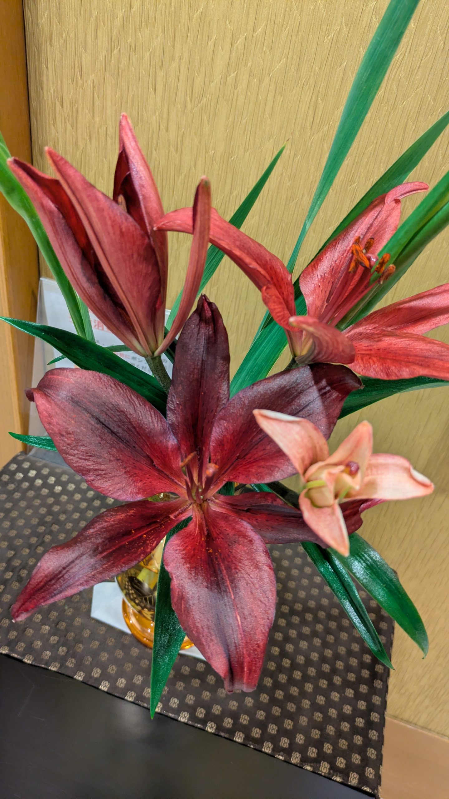 今回のアレンジメントでは、明るく華やかなガーベラや菊、やさしい色合いの小花、そして凛とした存在感を放つ百合などを組み合わせ、冬のロビー空間を温かく彩っています。